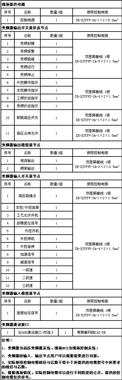 功率電纜的選型必須嚴格按照以下要求選型:電纜的載流量;電纜制造廠家的規(guī)范;安裝敷設(shè)的方式;電纜長度引起的壓降;符合電力行業(yè)規(guī)范;符合EMC規(guī)范。另變頻器與用戶設(shè)備(高壓電源柜、電機)之間的高壓電纜建議采用有屏蔽作用的鎧裝電纜(防止鼠害;滿足EMC要求)。