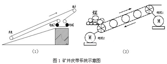 (2)卸完煤后的空皮帶經(jīng)過一個(gè)轉(zhuǎn)向輪,分別通過1#電機(jī)拖動的主動滾筒,和2#電機(jī)拖動的從動滾筒后,皮帶在經(jīng)過一個(gè)導(dǎo)向輪運(yùn)行到井底完成一次運(yùn)煤過程。