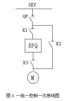 現(xiàn)場采用兩套山東新風(fēng)光電子科技發(fā)展有限公司生產(chǎn)的JD-BP37-450P高壓變頻調(diào)速系統(tǒng),額定電壓6kV,額定電流54A,額定功率450kW,采用“一拖一”主從控制方案,主回路控制接線如圖4所示。