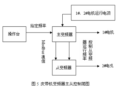 對于兩機(jī)驅(qū)動的皮帶機(jī)變頻控制,為了有效實(shí)現(xiàn)電機(jī)的負(fù)載平衡控制,高壓變頻調(diào)速系統(tǒng)適宜采用主-從方式進(jìn)行控制?,F(xiàn)場采用2臺450kW變頻器分別控制2臺400kW高壓電機(jī),如圖5所示,選用1#變頻器為主變頻器,2#變頻器為從變頻器,由操作臺發(fā)給主變頻器給定頻率值,主從變頻器之間采用ModBus總線通信,1#變頻器作為主控,檢測1#和2#電機(jī)的運(yùn)行電流,發(fā)出輸出轉(zhuǎn)矩給定值,控制2#從變頻調(diào)速系統(tǒng)同步運(yùn)行。