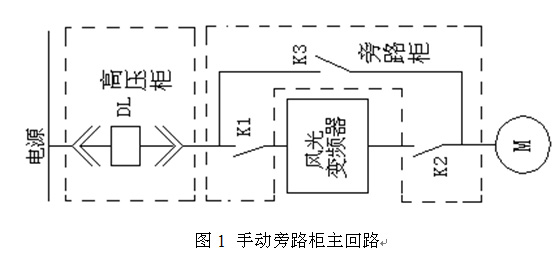 手動旁路中,共有3個(gè)高壓隔離開關(guān)K1、K2、K3,當(dāng)K1、K2閉合,K3斷開時(shí),10kV電源經(jīng)隔離刀閘K1到高壓變頻裝置,變頻裝置輸出經(jīng)K2送至電動機(jī),電動機(jī)變頻運(yùn)行;一旦變頻裝置出現(xiàn)故障,可斷開隔離刀閘K1、K2,合上K3,在工頻電源下啟動電機(jī)運(yùn)行,此時(shí)變頻器從高壓中隔離出來,便于檢修、維護(hù)和調(diào)試。隔離刀閘K1、K2、K3之間具有閉鎖和防止誤操作功能。