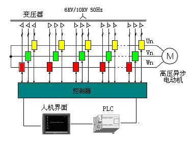如圖1所示,級(jí)聯(lián)式高壓變頻器主回路由輸入移相變壓器、功率單元、主控系統(tǒng)及電氣控制構(gòu)成。電網(wǎng)輸入為三相10kV或6kV,經(jīng)過移相變壓器變?yōu)閚個(gè)低壓、獨(dú)立、移相二次繞組電源,依次接入功率單元模塊,經(jīng)過整流、濾波和逆變輸出單相交流電源。若輸入為6kV,則每相由5個(gè)最大輸出電壓為759V的功率單元串聯(lián)而成,使輸出的相電壓最大值得到3795V,線電壓最大輸出為6572V,當(dāng)變頻器帶滿載時(shí),除掉變壓器壓降和功率單元壓降,則輸出大約為最大輸出的92%。移相變壓器電流多重化作用可以降低電網(wǎng)側(cè)電流諧波。5個(gè)二次繞組通過不同的聯(lián)結(jié)方式使它們之間的電流相位差為12°,在變壓器一次繞組側(cè)構(gòu)成30脈波整流電路,理論上可以消除電網(wǎng)側(cè)29次以下諧波。