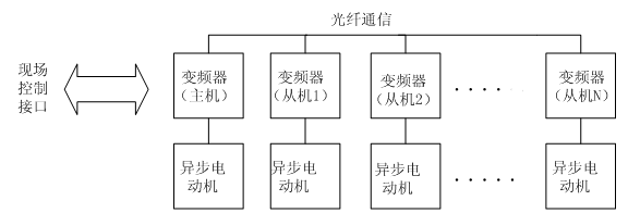 主機(jī)變頻器與各個(gè)從機(jī)變頻器之間通過光纖連接,一方面可采用高傳輸速率來提高響應(yīng)速度,另一方面實(shí)現(xiàn)了電氣隔離有助于減小外部干擾。