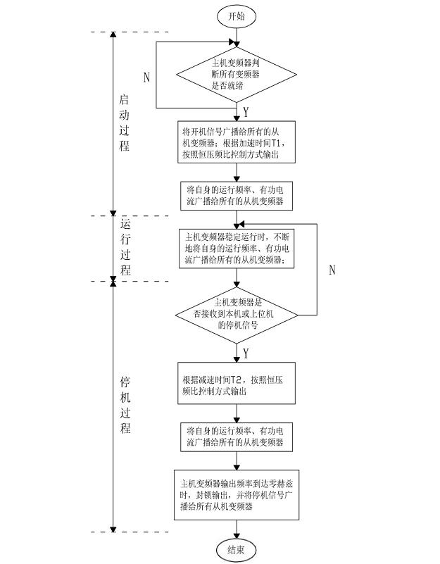 當(dāng)主機(jī)執(zhí)行開停機(jī)后,會(huì)根據(jù)預(yù)先設(shè)置好的頻率上升時(shí)間和下降時(shí)間進(jìn)行升頻、降頻。并將主機(jī)變頻器運(yùn)行頻率作為基準(zhǔn)頻率廣播發(fā)給各個(gè)從機(jī)變頻器。從機(jī)變頻器接收到主機(jī)變頻器發(fā)來的基準(zhǔn)頻率后,將自身運(yùn)行頻率調(diào)整到基準(zhǔn)頻率。