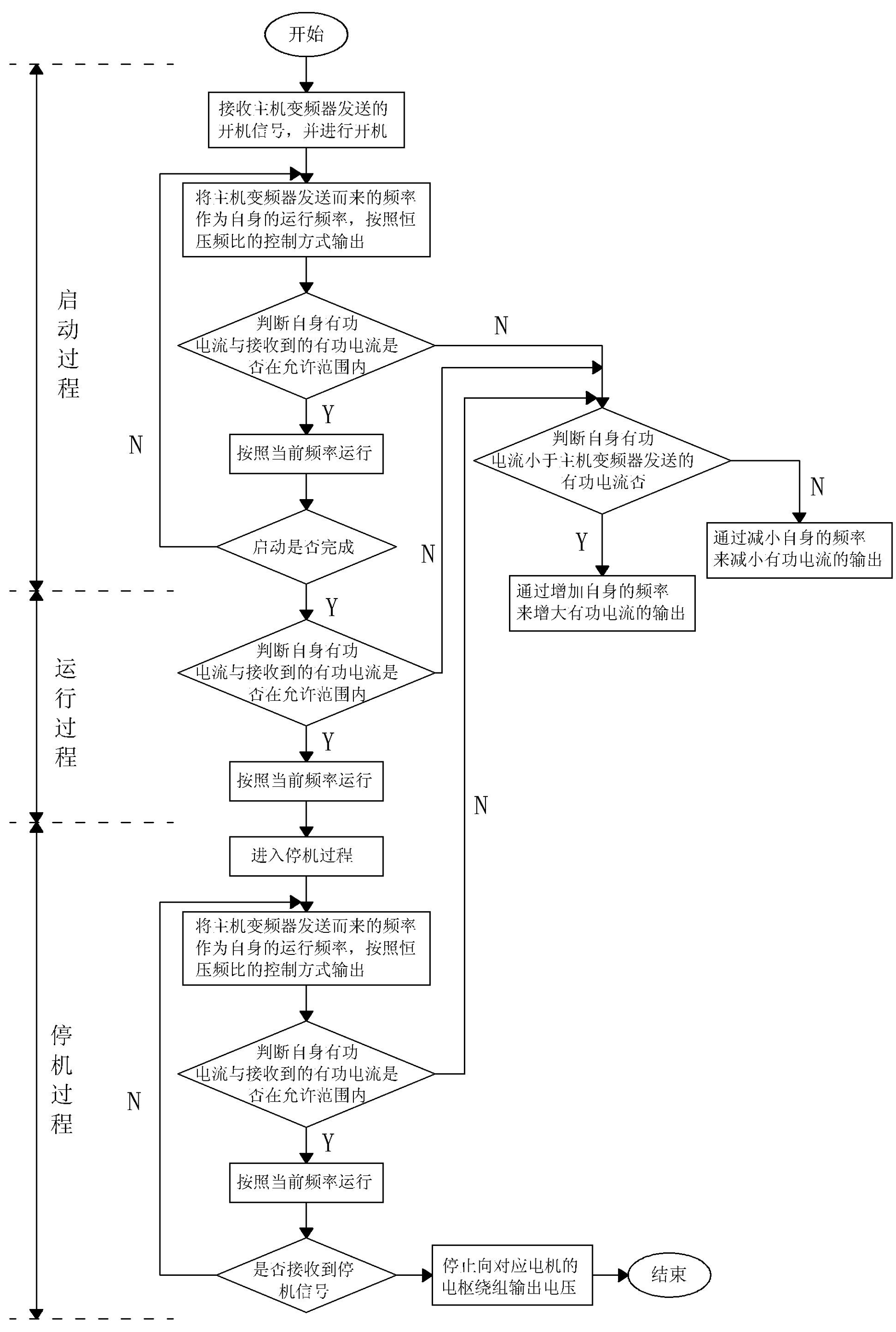 本文所涉及的多電機(jī)拖動(dòng)皮帶輸送機(jī)的恒壓頻比控制系統(tǒng)的控制方法,包括啟動(dòng)過程、運(yùn)行過程和停機(jī)過程,如圖7和圖8所示,分別給出了本控制方法中主機(jī)變頻器和從機(jī)變頻器的程序流程圖;