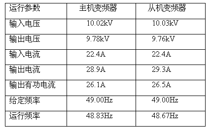 如在山西省某洗煤廠,雙機(jī)拖動(dòng)皮帶輸送機(jī)系統(tǒng)中,每臺(tái)電機(jī)的額定功率為560kW,額定電壓為10kV,每臺(tái)電機(jī)均由單獨(dú)的變頻器驅(qū)動(dòng)??刂品桨覆捎帽疚乃撌龅姆桨?,皮帶機(jī)系統(tǒng)能夠平穩(wěn)地啟動(dòng)、停機(jī)、以較高的效率變頻運(yùn)行。其基本運(yùn)行參數(shù)如下表所示,