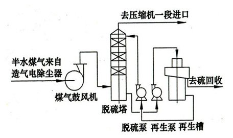 造氣 ->半水煤氣脫硫 ->壓縮機(jī)1段 ->變換 -> 變換氣脫硫 -> 壓縮機(jī)2段 ->脫碳 -> 精脫硫 ->甲烷化 ->壓縮機(jī)3,4,5段 ->氨合成 ->產(chǎn)品NH3
