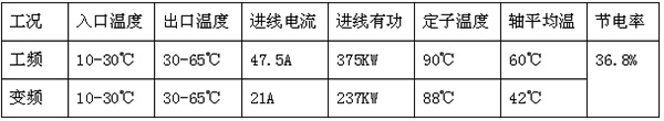 根據(jù)生產(chǎn)情況,風(fēng)機(jī)運(yùn)行30HZ左右就能滿足了生產(chǎn)工藝要求;運(yùn)行轉(zhuǎn)速在額定轉(zhuǎn)速的60%左右。由于電機(jī)為水冷卻,在低轉(zhuǎn)速下發(fā)熱量并沒(méi)有提高,完全滿足了工況運(yùn)行。