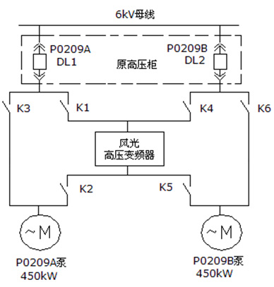 因現(xiàn)有6kV配電室沒有足夠空間,決定采用變頻器的1拖2功能,可分別拖動P0209A/B兩臺泵。且采用手動旁路功能。一拖二變頻調(diào)速系統(tǒng)原理圖如下: