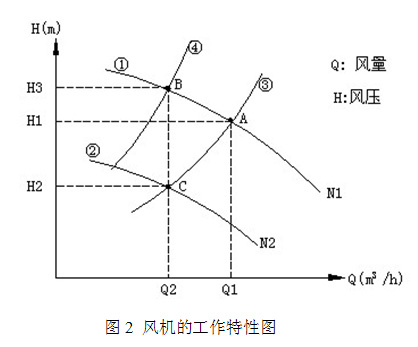 曲線①為風(fēng)機(jī)按轉(zhuǎn)速N1工作時(shí)的特性曲線,曲線②為風(fēng)機(jī)按轉(zhuǎn)速N2工作時(shí)的特性曲線,③④為風(fēng)道阻力曲線。