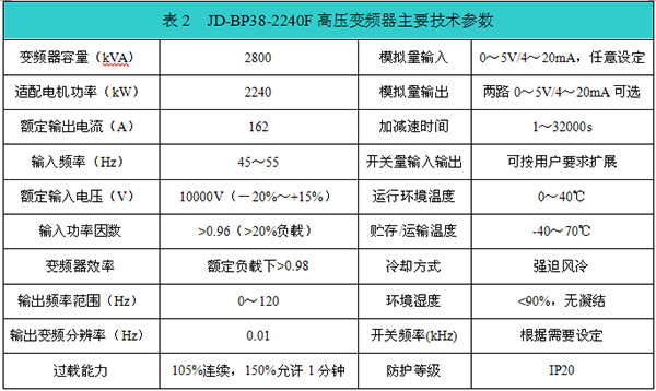 風(fēng)光牌高壓變頻器為高--高電壓源型模式,由移相變壓器,功率單元和控制器組成。JD-BP38-2240F高壓變頻器采用48脈沖整流,功率單元每相采用8個(gè)功率單元串接組成,三相共24個(gè)單元;輸出相電壓為17電平,輸出線電壓33電平,功率單元旁路單元采用可控硅作為旁路器件,不降額運(yùn)行??刂破鞑糠忠愿咚傥⑻幚砥鲗?shí)現(xiàn)控制以及與子微處理器間進(jìn)行通信。風(fēng)光高壓變頻器采用模塊化設(shè)計(jì),互換性好、維修簡單。JD-BP38-2240F高壓變頻器主要技術(shù)參數(shù)如表2所示。