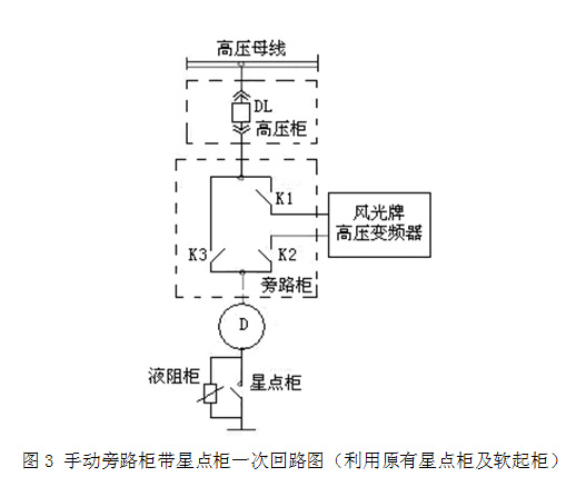 脫硫增壓風(fēng)機(jī)是脫硫系統(tǒng)正常運(yùn)行的關(guān)鍵設(shè)備之一,如果不能保證增壓風(fēng)機(jī)正常運(yùn)行,將迫使脫硫系統(tǒng)停運(yùn),影響燒結(jié)生產(chǎn)。因此,增壓風(fēng)機(jī)變頻改造要在選擇可靠性高的變頻器產(chǎn)品的基礎(chǔ)上,還應(yīng)該配備工頻旁路柜,即便變頻器故障、檢修時(shí)也可實(shí)現(xiàn)電機(jī)工頻旁路運(yùn)行,以保證風(fēng)機(jī)拖動(dòng)而不影響脫硫系統(tǒng)的正常運(yùn)行。配備工頻旁路柜的作用是,如果發(fā)生變頻器故障跳閘,能夠切換為工頻旁路運(yùn)行。變頻器故障消除恢復(fù)投運(yùn)時(shí),可以先切除增壓風(fēng)機(jī)旁路開關(guān),依托變頻器的飛車啟動(dòng)功能,在增壓風(fēng)機(jī)高速惰走的情況下恢復(fù)變頻器設(shè)備運(yùn)行,從而大大減小風(fēng)壓波動(dòng)的時(shí)間。其主回路如圖3所示,采用一拖一手動(dòng)旁路帶星點(diǎn)柜控制方案。