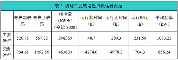 在燒結(jié)產(chǎn)量基本相同的情況下,煉鐵廠節(jié)能服務(wù)中心對(duì)增壓風(fēng)機(jī)正常運(yùn)行時(shí)參數(shù)實(shí)際測(cè)量如表3所示。增壓風(fēng)機(jī)工頻運(yùn)行,電機(jī)實(shí)際功率1073.23kW;增壓風(fēng)機(jī)變頻運(yùn)行,電機(jī)實(shí)際功率658.24kW;電機(jī)功率減小414.99kW。按照增壓風(fēng)機(jī)年運(yùn)行小時(shí)數(shù)為7000h,年節(jié)省電量大約為290.493萬kW·h,電價(jià)按照0.30元/kW·h計(jì),則一臺(tái)增壓風(fēng)機(jī)變頻改造的收益為871499元。