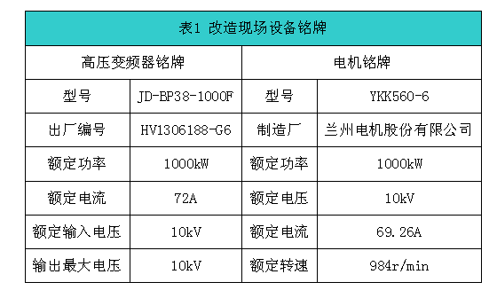 (1)改造現(xiàn)場(chǎng)設(shè)備介紹改造現(xiàn)場(chǎng)設(shè)備銘牌如表1所示。