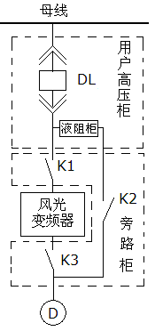 旁路柜中,共有3個高壓隔離開關(guān),為了確保不向變頻器輸出端反送電,K2與K3采用電磁互鎖操動機構(gòu),實現(xiàn)電磁互鎖。當(dāng)K1、K3閉合,K2斷開時,電機變頻運行;當(dāng)K1、K3斷開,K2閉合時,利用液阻柜啟動電機工頻運行,此時變頻器從高壓中隔離出來,便于檢修、維護(hù)和調(diào)試。