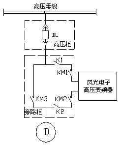旁路柜主要配置:三個(gè)真空接觸器(KM1、KM2、KM3)和兩個(gè)刀閘隔離開(kāi)關(guān)K1、K2。KM2與KM3實(shí)現(xiàn)電氣互鎖,當(dāng)KM1、KM2閉合,KM3斷開(kāi)時(shí),電機(jī)變頻運(yùn)行;當(dāng)KM1、KM2斷開(kāi),KM3閉合時(shí),電機(jī)工頻運(yùn)行。另外,KM1閉合時(shí),K1操作手柄被鎖死,不能操作;KM2閉合時(shí),K2操作手柄被鎖死,不能操作。