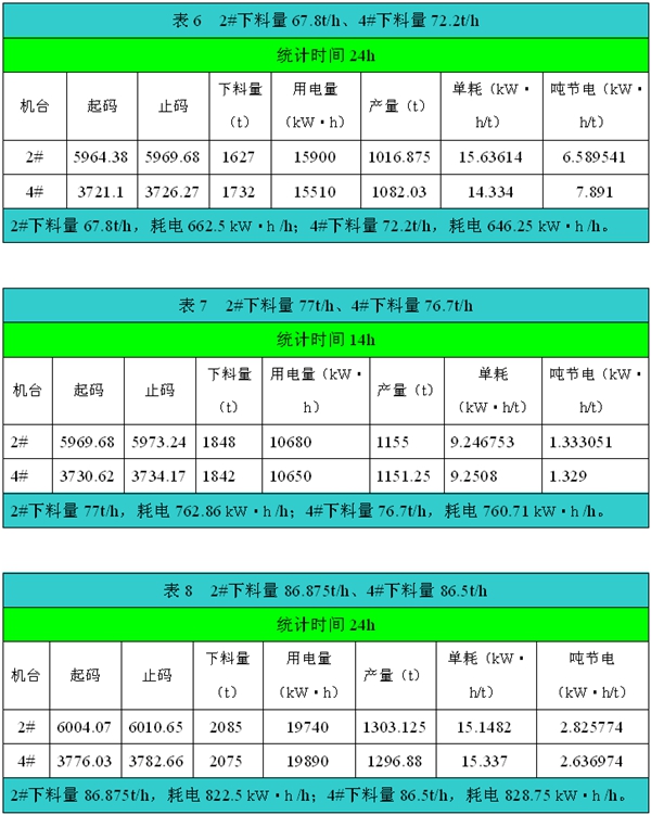 為了進(jìn)一步測(cè)試節(jié)能效果,分別統(tǒng)計(jì)2#、4#焙燒爐在不同下料量的情況下,除塵ID風(fēng)機(jī)的耗電量,統(tǒng)計(jì)數(shù)據(jù)如表6、表7、表8所示。