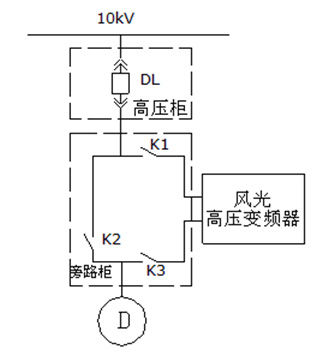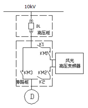 旁路柜主要配置:三個高壓斷路器(KM1、KM2、KM3)和兩個刀閘隔離開關(guān)K1、K2。KM2與KM3實現(xiàn)電氣互鎖,當(dāng)KM1、KM2閉合,KM3斷開時,電機變頻運行;當(dāng)KM1、KM2斷開,KM3閉合時,電機工頻運行。另外,KM1閉合時,K1操作手柄被鎖死,不能操作;KM2閉合時,K2操作手柄被鎖死,不能操作。