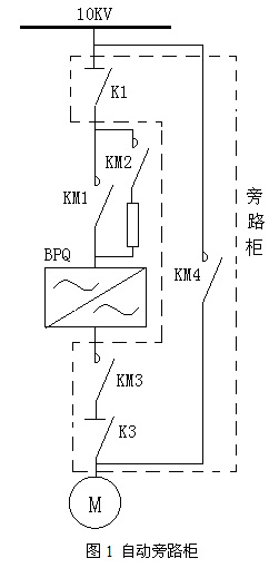 根據(jù)用戶現(xiàn)場(chǎng)的實(shí)際情況,旁路柜采用了一拖一工變頻自動(dòng)轉(zhuǎn)換方案。如圖1所示。旁路柜中,共有2個(gè)高壓隔離開關(guān)和2個(gè)真空接觸器,為了確保不向變頻器輸出端反送電,KM3與KM4采用電氣互鎖。當(dāng)K1、K3、KM1和KM3閉合,KM4斷開時(shí),電機(jī)變頻運(yùn)行;當(dāng)KM1、KM3斷開,KM4閉合時(shí),電機(jī)工頻運(yùn)行,此時(shí)變頻器從高壓中隔離出來,便于檢修、維護(hù)和調(diào)試。