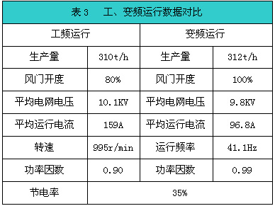 為了對(duì)窯尾高溫風(fēng)機(jī)系統(tǒng)變頻改造后的效果進(jìn)行評(píng)價(jià),在系統(tǒng)投入正常運(yùn)行后對(duì)設(shè)備實(shí)際使用和節(jié)電情況進(jìn)行了測(cè)定和數(shù)據(jù)分析。工、變頻生產(chǎn)工況基本相同,隨機(jī)抽取一個(gè)正常工作日,將系統(tǒng)切換工頻運(yùn)行采用風(fēng)門調(diào)節(jié)風(fēng)量,網(wǎng)側(cè)記錄運(yùn)行數(shù)據(jù),然后將系統(tǒng)切換變頻運(yùn)行,記錄運(yùn)行數(shù)據(jù),具體數(shù)據(jù)如下表3示: