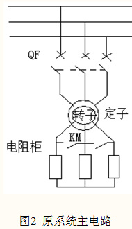 原系統(tǒng)是采用繞線電機(jī)串電阻降壓?jiǎn)?dòng),然后全壓運(yùn)行的方式進(jìn)行控制的,如圖2示。