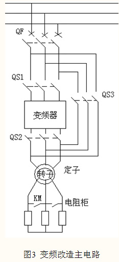 變頻改造后的系統(tǒng)主電路如圖3示,從變頻器的輸入隔離開關(guān)QS1、輸出隔離開關(guān)QS2各取一對(duì)動(dòng)斷觸點(diǎn)串入電阻柜內(nèi)接觸器KM的合閘回路,保證變頻啟動(dòng)時(shí)切除電阻啟動(dòng)。