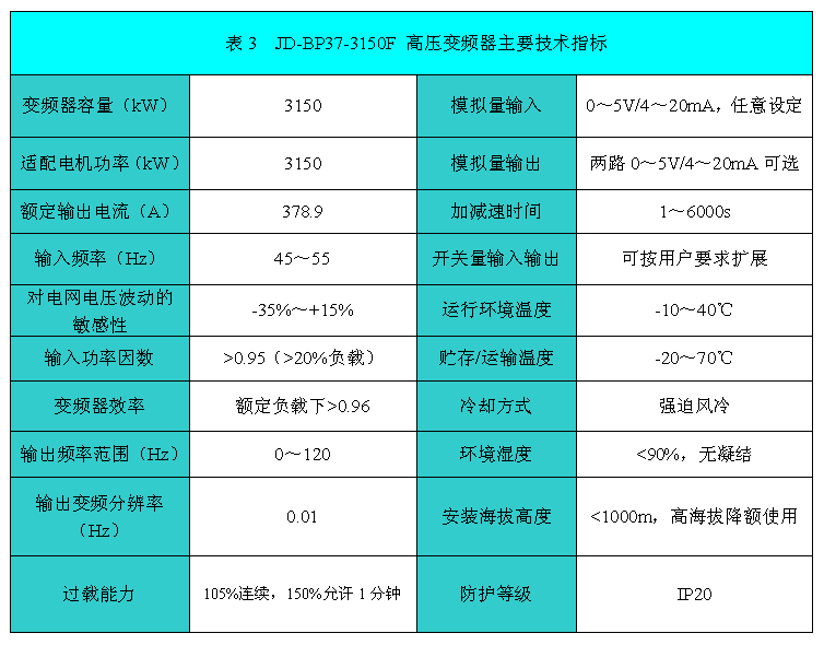 JD-BP37-3150F高壓變頻器技術(shù)指標如表3所示。