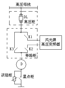 高溫風機原配置帶星點柜配置液阻啟動柜,本次改造保留原有星點柜和液阻柜保持不變。需要將星點柜斷路器的一組常開點引至變頻器。需要變頻拖動電機時,液阻柜按原控制方式啟動。即上級高壓開關(guān)柜給變頻器送電后,液阻柜得到開關(guān)柜閉合狀態(tài)信號后就啟動。星點柜閉合后,變頻器檢測到閉合信號后方具備開機條件,然后根據(jù)實際情況給變頻器啟動信號,變頻投入運行。工頻運行時,閉合K3,斷開K1,K2,液阻柜按原先工頻方式啟動,完成星點柜和液阻柜的啟動,達到電機軟啟動。