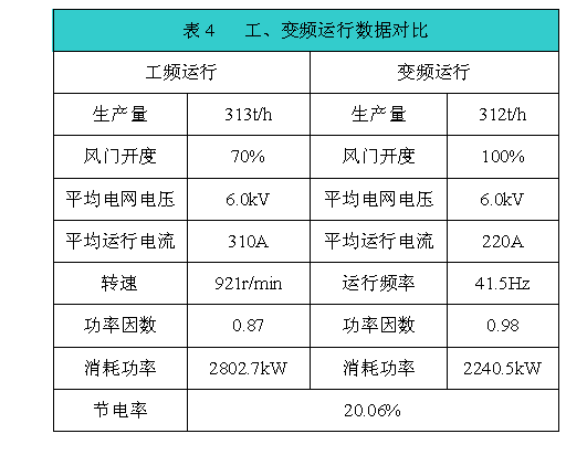 為了對窯尾高溫風機系統(tǒng)變頻改造后的效果進行評價,在系統(tǒng)投入正常運行后對設(shè)備實際使用和節(jié)電情況進行了測定和數(shù)據(jù)分析。工、變頻生產(chǎn)工況基本相同,隨機抽取一個正常工作日,將系統(tǒng)切換工頻運行采用風門調(diào)節(jié)風量,網(wǎng)側(cè)記錄運行數(shù)據(jù),然后將系統(tǒng)切換變頻運行,記錄運行數(shù)據(jù),具體數(shù)據(jù)如表4所示。
