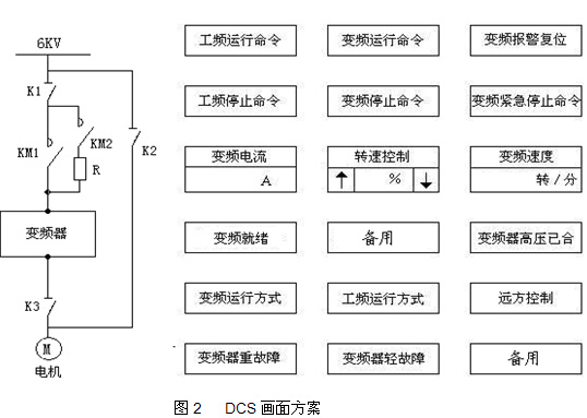 如圖2所示,利用DCS控制系統(tǒng)的預(yù)留點(diǎn),設(shè)計(jì)高壓變頻改造控制、運(yùn)行監(jiān)視系統(tǒng),系統(tǒng)包括工、變頻的運(yùn)行、停止命令按鈕;轉(zhuǎn)速調(diào)節(jié)按鈕;變頻器復(fù)位按鈕、緊急停止按鈕;變頻器運(yùn)行電流、電機(jī)轉(zhuǎn)速顯示;高壓柜以及變頻合閘顯示;變頻器故障報(bào)警顯示。