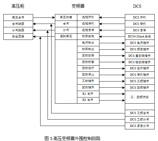 如圖3所示,DCS系統(tǒng)輸出 4-20mA電流信號(hào)控制JD-BP37高壓變頻調(diào)速系統(tǒng)的運(yùn)行頻率, 來控制電機(jī)的運(yùn)行轉(zhuǎn)速。JD-BP37高壓變頻調(diào)速系統(tǒng)反饋4-20mA電流信號(hào)指示JD-BP37高壓變頻調(diào)速系統(tǒng)的輸出頻率、輸出電流。JD-BP37高壓變頻調(diào)速系統(tǒng)同時(shí)接收DCS控制系統(tǒng)的啟動(dòng)、停止、急停、復(fù)位控制信號(hào),調(diào)整運(yùn)行狀態(tài)。