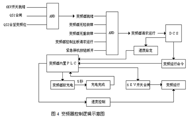 如圖4所示,當(dāng)所有開機(jī)條件都具備后,DCS發(fā)出變頻運(yùn)行命令,變頻器內(nèi)置PLC發(fā)出“合閘”信號(hào)至6kV高壓柜,現(xiàn)場(chǎng)6kV小車開關(guān)合閘,變頻器進(jìn)行軟充電,5S后充電完成,變頻器處于就緒狀態(tài),由DCS給出4-20mA信號(hào)控制變頻器頻率來改變電機(jī)轉(zhuǎn)速。