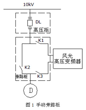 圖1旁路柜中,共有3個高壓隔離開關,為了確保不向變頻器輸出端反送電,K2與K3采用電磁互鎖操動機構,實現(xiàn)電磁互鎖。當K1、K3閉合,K2斷開時,電機變頻運行;當K1、K3斷開,K2閉合時,電機工頻運行,此時變頻器從高壓中隔離出來,便于檢修、維護和調試。
