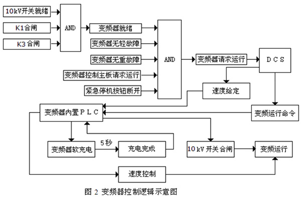 如圖2所示,當所有開機條件都具備后,DCS發(fā)出變頻運行命令,變頻器內置PLC發(fā)出“合閘”信號至10kV高壓柜,高壓斷路器開關合閘,變頻器進行軟充電,5S后充電完成,變頻器處于就緒狀態(tài),由DCS給出4~20mA信號控制變頻器頻率來改變電機轉速。