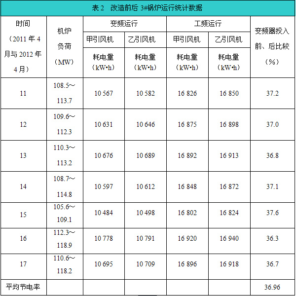 通過(guò)表2數(shù)據(jù)對(duì)比,從節(jié)電率分析,3#機(jī)組在發(fā)電負(fù)荷相同情況時(shí),3#機(jī)組兩臺(tái)引風(fēng)機(jī)工頻運(yùn)行每天平均耗電量33 753kW·h,3#機(jī)組兩臺(tái)引風(fēng)機(jī)變頻運(yùn)行每天平均耗電量21 279kW·h,節(jié)約電量12 474kW·h,節(jié)電率為36.96%。