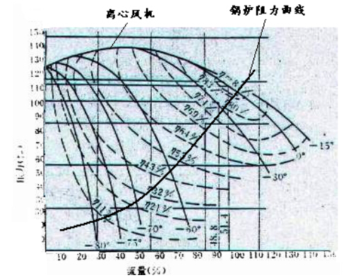 圖1所示為300MW火電機(jī)組引風(fēng)機(jī)性能曲線示意圖,該風(fēng)機(jī)為離心式,進(jìn)口導(dǎo)葉調(diào)節(jié)風(fēng)量,圖中0o 為調(diào)節(jié)門全開位置,負(fù)值為調(diào)節(jié)門向關(guān)閉方向轉(zhuǎn)動(dòng)的角度;圖中虛線為等效率線。離心式風(fēng)機(jī)的最高效率在進(jìn)口調(diào)節(jié)門的最大開度處,等效率線和鍋爐阻力曲線接近垂直,效率沿阻力線迅速下降。