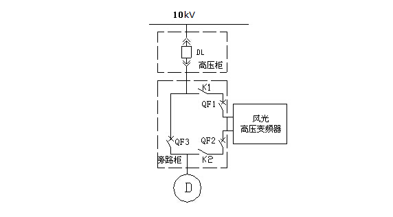 旁路柜主要配置:三個(gè)真空斷路器(QF1、QF2、QF3)和兩個(gè)刀閘隔離開關(guān)K1、K2。QF2與QF3實(shí)現(xiàn)電氣互鎖,當(dāng)QF1、QF2閉合,QF3斷開時(shí),電機(jī)變頻運(yùn)行;當(dāng)QF1、QF2斷開,QF3閉合時(shí),電機(jī)工頻運(yùn)行。另外,QF1閉合時(shí),K1操作手柄被鎖死,不能操作;QF2閉合時(shí),K2操作手柄被鎖死,不能操作?!?br/>電機(jī)工頻運(yùn)行時(shí),若需對變頻器進(jìn)行故障處理或維護(hù),切記在QF1、QF2分閘狀態(tài)下,將隔離刀閘K1和K2斷開。