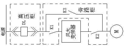 手動旁路中,共有3個高壓隔離開關(guān)K1、K2、K3,當K1、K2閉合,K3斷開時,6kV電源經(jīng)隔離刀閘K1到高壓變頻裝置,變頻裝置輸出經(jīng)K2送至電動機,電動機變頻運行;一旦變頻裝置出現(xiàn)故障,可斷開隔離刀閘K1、K2,合上K3,在工頻電源下啟動電機運行,此時變頻器從高壓中隔離出來,便于檢修、維護和調(diào)試。隔離刀閘K1、K2、K3之間具有閉鎖和防止誤操作功能。
