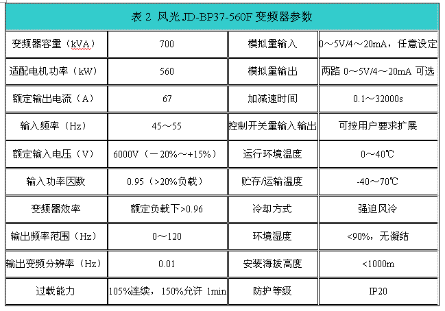 鄒平齊星開發(fā)區(qū)熱電有限公司6號機(155MW)排粉風(fēng)機改造選用風(fēng)光JD-BP37-560F高壓變頻器2臺、并配置手動旁路柜,用于變頻/工頻切換。采用“一拖一”變頻控制。風(fēng)光JD-BP37-560F變頻器參數(shù)如表2所示。