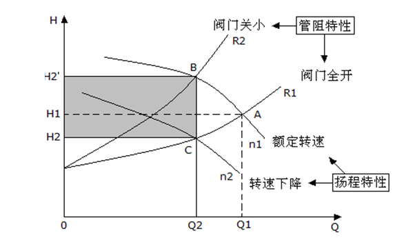 直觀的水泵(或風(fēng)機(jī))工作曲線圖見圖1:水泵(或風(fēng)機(jī))的正常工作點(diǎn)為A,當(dāng)水量(或風(fēng)量)需要從Q1調(diào)到Q2時(shí),采用閥門調(diào)節(jié),管網(wǎng)特性曲線由R1(閥門全開)改變?yōu)镽2(閥門關(guān)?。涔ぷ鼽c(diǎn)調(diào)至B點(diǎn),其功率為OQ2BH2’所圍成的面積,其功率變化很小,而其效率卻隨之降低。當(dāng)采用變頻調(diào)速時(shí),可以按需要升降電機(jī)轉(zhuǎn)速,改變設(shè)備的性能曲線,圖中從n1(額定轉(zhuǎn)速)到n2(轉(zhuǎn)速下降),其工作點(diǎn)調(diào)至C點(diǎn),使其參數(shù)滿足工藝要求,其功率為OQ2CH2所圍成的面積,同時(shí)其效率曲線也隨之平移,依然工作在高效區(qū)。圖中陰影部分為實(shí)際節(jié)約能耗。