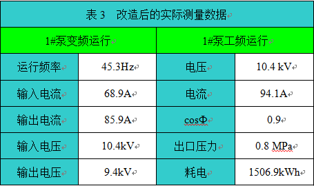 循環(huán)水泵變頻改造后,2017年3月,高壓變頻器一次性投入生產(chǎn),至今運(yùn)行正常。經(jīng)過廠節(jié)能服務(wù)中心測試,系統(tǒng)達(dá)到了預(yù)期的效果。水泵變頻改造后,循環(huán)水泵輸入電流有明顯下降,設(shè)備實(shí)現(xiàn)了軟起動(dòng),改善了設(shè)備的運(yùn)行工況,極大地減輕了設(shè)備起動(dòng)時(shí)對(duì)供配電系統(tǒng)的沖擊。改造前后1#給水泵工變頻運(yùn)行正常統(tǒng)計(jì)數(shù)據(jù)如表3所示。