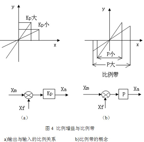 在專用PID調(diào)節(jié)器中,比例增益的大小常常是通過“比例帶”來進(jìn)行調(diào)節(jié)的。所謂比例帶,就是按比例放大的區(qū)域,用P表示,P為比例增益的倒數(shù),即