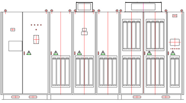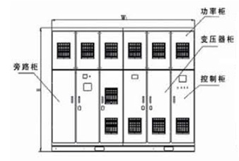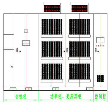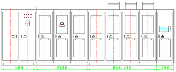 設(shè)計之初,為保證產(chǎn)品的可靠性、穩(wěn)定性,采用雙重冗余設(shè)計的模式,即加大了單元的數(shù)量,也增大了各器件的選型。10kV采用每相10個單元或13個單元,6kV采用每相6個單元或8個單元;功率器件選型余量大至2.5倍甚至3倍,電解電容選擇90-120UF/A,變壓器鐵芯、風(fēng)機(jī)風(fēng)量選型都不同程度的大一規(guī)格。其排布則延續(xù)傳統(tǒng)的排布模式,即從左往右依次為切換柜、變壓器柜、(接線柜)、功率柜、控制柜的模式,其外形如圖(1):