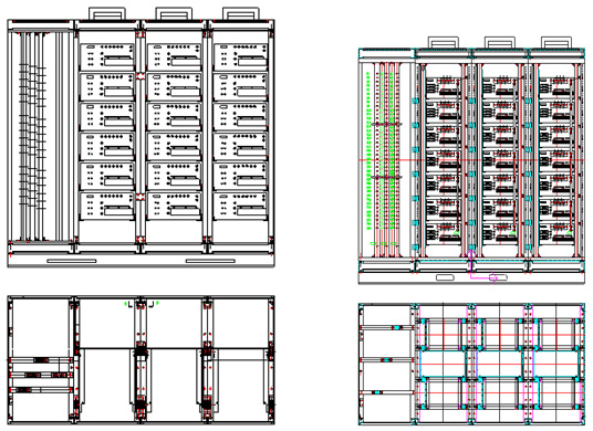 其抽屜式[1]功率單元在功率柜的排布:6kV級、10kV級均是從左往右分別三相,每相豎排。6kV級每相6個單元的豎排;10kV級為前后布置,10個單元的前5后5組合成一相,13個單元的前7后6組合成一相。接線方式從移相變壓器次級出來,經(jīng)接線柜從功率柜底部進(jìn)入各相,每相之間均有加線板。具體排布6kV如圖(2)、10kV如圖(3):