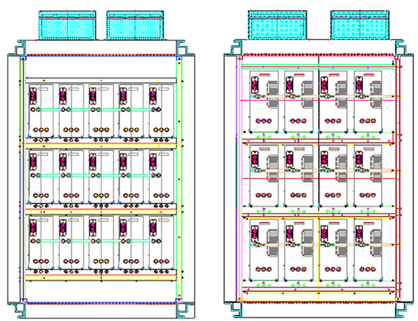 隨著高壓變頻器市場規(guī)模的不斷擴(kuò)大,用戶對變頻的苛求也越來越嚴(yán)格。作為產(chǎn)品開發(fā)商,也不斷為提升產(chǎn)品質(zhì)量與檔次作著不懈努力,所用柜體也由原來的單一種類向更寬范方向發(fā)展,其產(chǎn)品功能、質(zhì)量與外形都在不斷升級。同規(guī)格變頻器原體積如圖(4)。其單元結(jié)構(gòu)排布也有了更新的認(rèn)知,由于原來每相豎排所用電纜多、結(jié)構(gòu)復(fù)雜、附加成本大,便改為每相單元橫排,使變壓器次級引線分別對應(yīng)A、B、C三相,不再有接線柜,直接通過電纜托板到達(dá)各單元,不再迂回,其控制柜也由原來的600mm轉(zhuǎn)為400mm。另一個飛躍則是每相單元數(shù)量的減少,如10kV改為8單元/相,6kV改為5單元/相。功率單元數(shù)量少了,其整機(jī)質(zhì)量并沒有受到影響,相反其故障點卻相應(yīng)減少,加之電路結(jié)構(gòu)上星點漂移技術(shù)的應(yīng)用,使得變頻器性能更加優(yōu)越。功率柜具體排布情況,6kV5個單元,每相橫向分布,上、中、下三相如圖(5)所示。10kV如果采取單元前后放置,每相前4后4,如圖(6)所示: