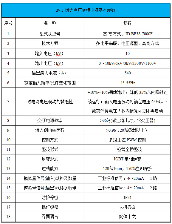 風光高壓變頻電源系統(tǒng),以高可靠性、易操作、高性能為設計目標。高壓變頻電源系統(tǒng)采用新IGBT功率器件,全數字化微機控制,有關電源基本參數如表1所示。