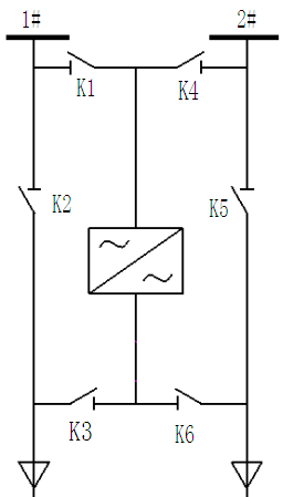 吉林某水務集團結(jié)合該自身的實際情況,為滿足泵站的安全運行需求,要求水泵電機一用一備設置,因此選擇了新風光JD-BP38系列高壓變頻調(diào)速系統(tǒng)中一拖二手動運行的主回路,主回路圖如圖3所示。其中K1刀閘與K4刀閘互鎖,保證兩路高壓電源不會同時作用于變頻回路;K2刀閘與K3刀閘互鎖,保證工頻電源與變頻電源不會同時作用于電機M1;K5刀閘與K6刀閘互鎖,保證工頻電源與變頻電源不會同時作用于電機M2.