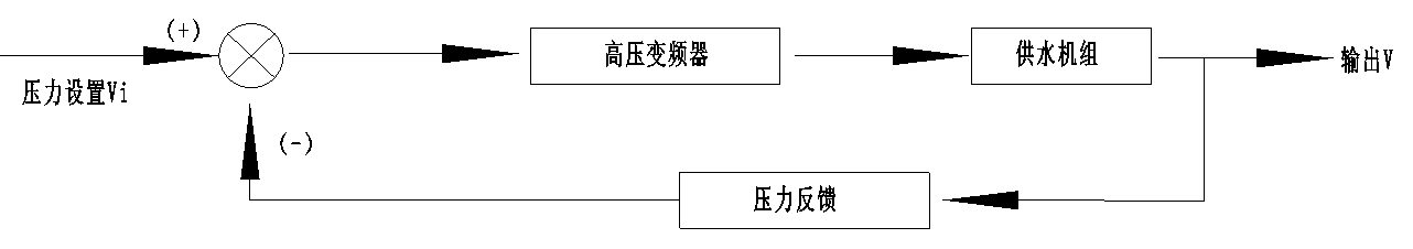 為滿足不同時段不同地區(qū)的用水壓力需求,該水廠采用先進的恒壓供水控制系統(tǒng),可以對水廠出口處的水壓值V進行精確的處理和控制,并與壓力設置值Vi構(gòu)成閉環(huán)控制系統(tǒng)。恒壓供水系統(tǒng)原理如圖2所示。變頻器內(nèi)部的主控DSP采集供水壓力值V與用戶給定值Vi進行比較和運算,通過PID進行調(diào)整,將結(jié)果轉(zhuǎn)換為頻率調(diào)節(jié)信號送至變頻器,直至達到供水壓力的給定值Vi。不管系統(tǒng)供水流量如何變化,供水壓力值V始終維持在給定壓力值Vi附近。