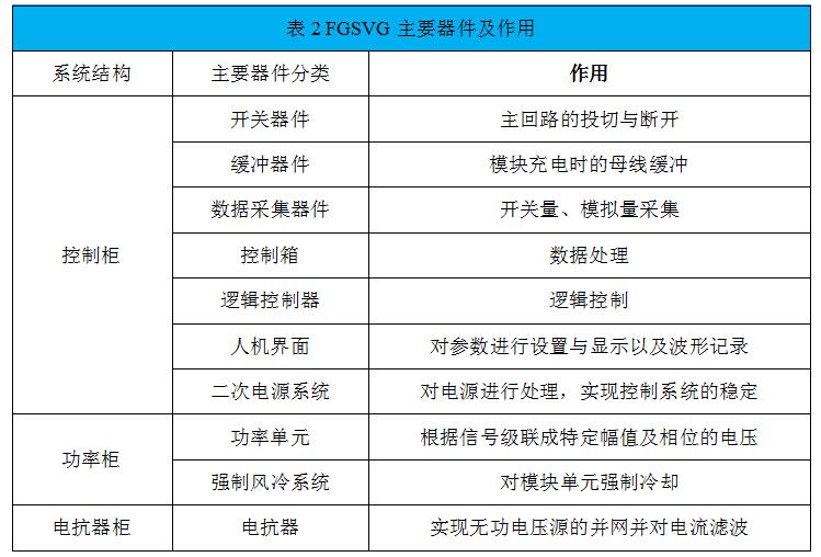 FGSVG系列產(chǎn)品主要分為三部分:控制柜、功率柜、電抗器柜。其中功率柜實現(xiàn)了統(tǒng)一設(shè)計,方便產(chǎn)品的擴(kuò)展及穩(wěn)定性。各電壓等級的裝置由控制柜、功率柜及電抗器柜(或空心電抗)組成。各柜體中主要器件及作用如表2所示。