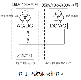 系統(tǒng)組成框圖如圖1所示,現(xiàn)在大部分城市軌道交通牽引所都是35kV或10kV電網(wǎng),經(jīng)過牽引整流變壓器,再進行12脈波整流輸出直流1500V或750V給機車供電。